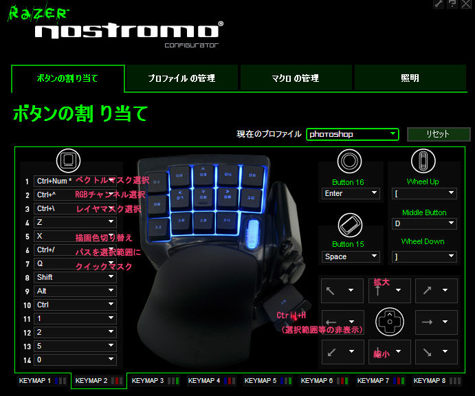 私の割り当てはこんな感じで 一部よく使う機能のPhotoshop側のショートカットを変えることで登録してます